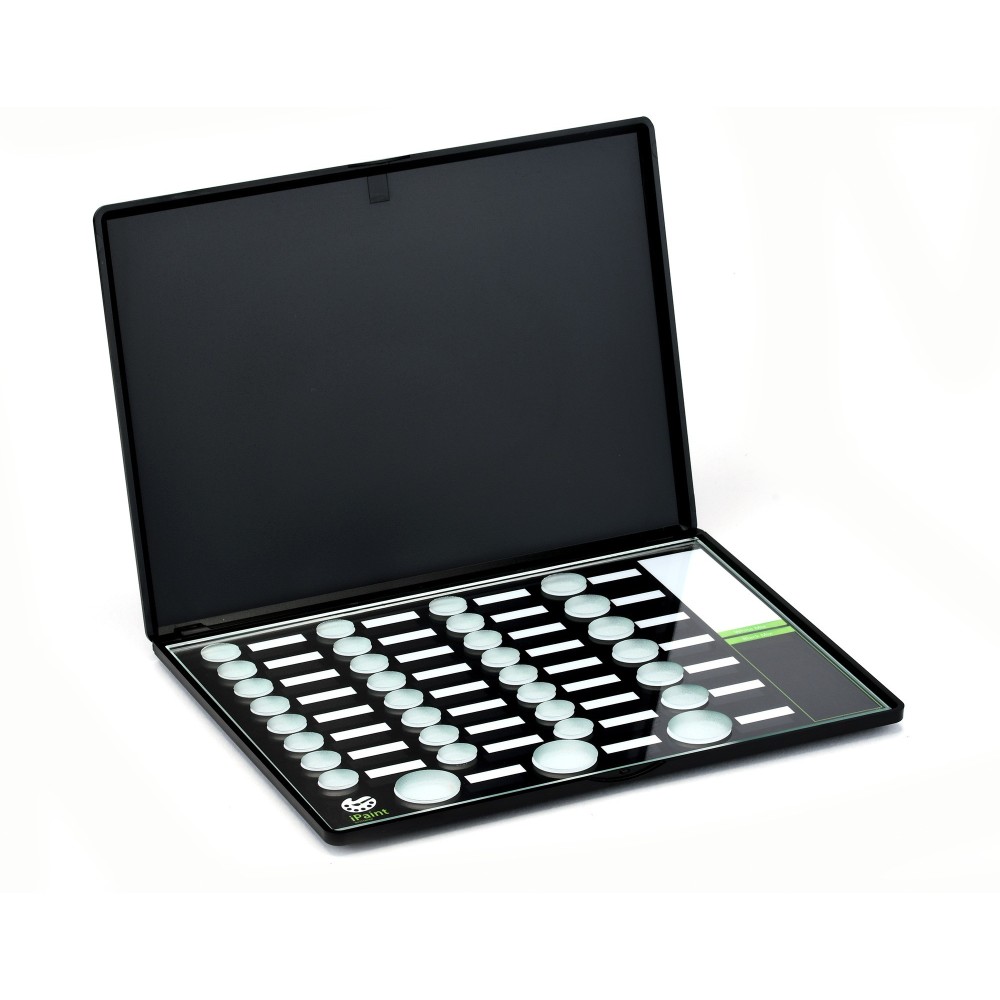 Plastic box with lid and click closure with a glass inside consisting of 33 wells, hollowed out inside to contain stains and liquid dental ceramics; 6 of these wells are wider to hold the most commonly used colors and 3 even larger to hold glazing and glazing liquid. The glass can be removed with a special suction cup to make it easier to clean. Compared to the previous version, the glass is wider, the lid is further away from the glass to prevent it from getting dirty after closing and the oval-shaped wells are much deeper and more capacious. In the part below the glass there is a plasticized panel where it is possible to write the name of each individual color in correspondence with the well; You can write with a permanent pen and erase the writing with alcohol. In addition, on the right side of the glass there are 2 spaces, one white and one black, for mixing colors. A suction cup to remove the glass, a black permanent pen and an empty 30 ml bottle with a dropper dispenser are supplied to hold stained liquids.