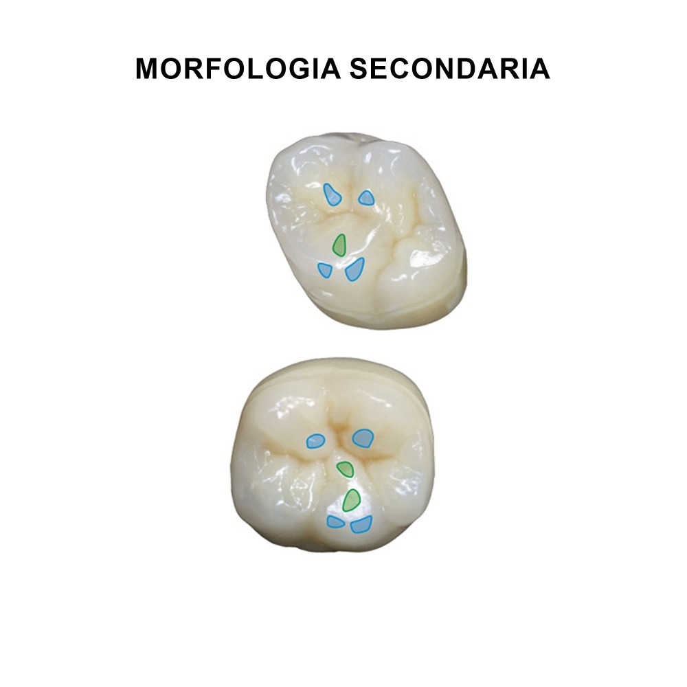 The Secondary Morphology (SM/SS) highlights contacts with light abraded surfaces. The base of the tooth (heel) is slightly reduced.