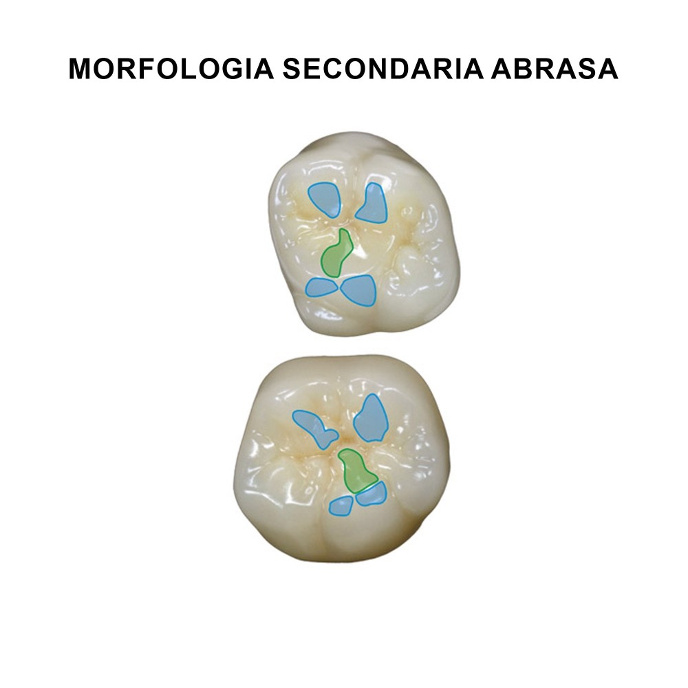 Abraded secondary morphology Secondary Abraded Morphology (SLA/SMA/SSA) shows extensive contact with multiple abraded surfaces and a lower inclination of the cusps. The heel of the tooth is arranged in the shape of a tunnel; This allows for a real time saving during assembly, equal to 70-80% in bead reduction. Abraded Secondary Morphology can be used for all types of prosthetic restorations.