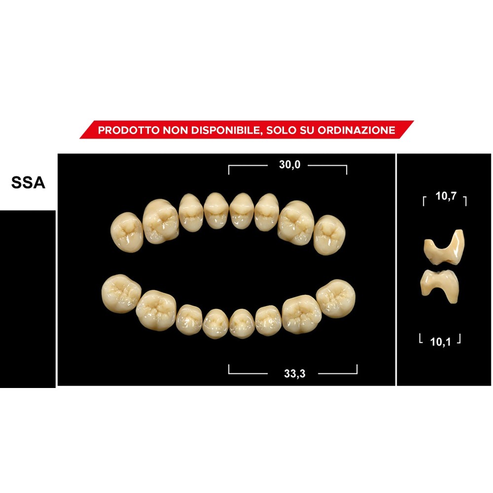 Advantages: - optimal interdental spaces due to the characteristics of the tooth body; - easy assembly method; - very beautiful realization of the masticatory surfaces with the transfer of the occlusal compass from the natural waxing technique.