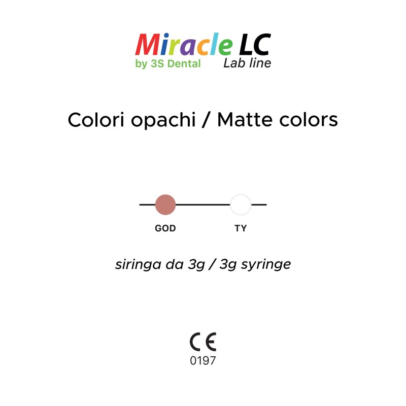 Miracle LC Lab Line is the 3S Dental line of composites for layering and characterizing temporary or permanent restorations in resin, ceramic, zirconium, metal, and PEEK.