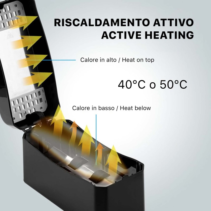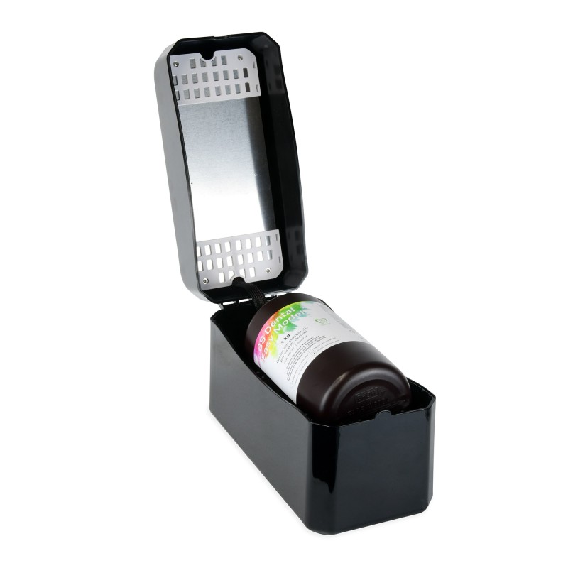 This device stirs resin without creating foam or bubbles. It offers a bidirectional rotation function, alternating clockwise and counterclockwise rotation with two modes: high and low speed. Thanks to two heating elements, one in the base and one in the lid, you can preheat resins to two temperatures (40°C or 50°C), an essential feature for the coldest times of the year. Suitable for 250g, 500g, and 1kg bottles.
