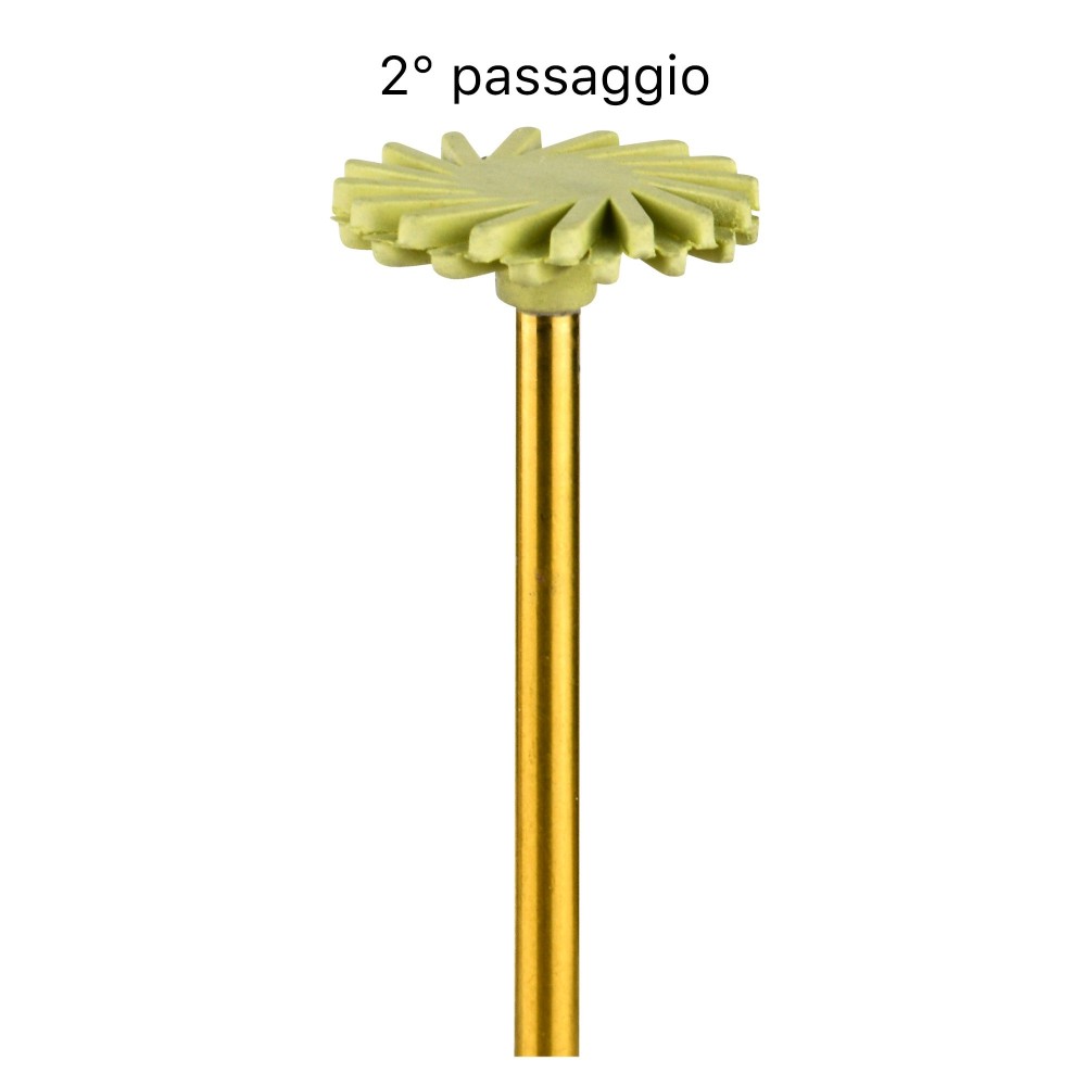 Suitable for three-phase polishing of composite; The high concentration of natural synthetic-bonded diamonds promote optimal polishing of even the hardest composites. The particular lamellar shape significantly increases the contact area compared to traditional polishing systems, reduces heat development during processing and significantly increases durability. Compatible with all types of composite.