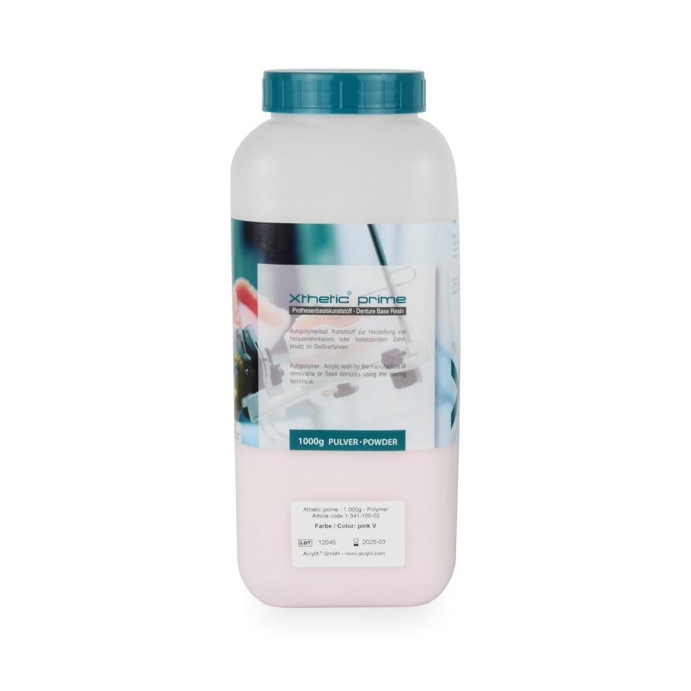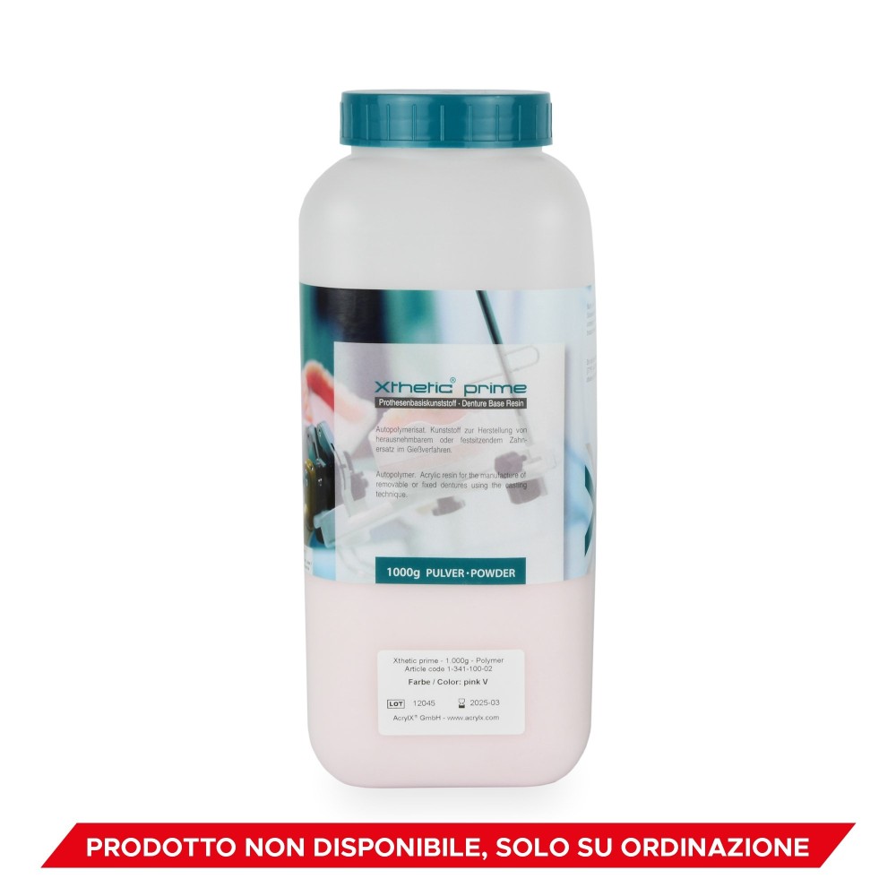 Xthetic® prime is a low-temperature resin of definitive polymerization for prostheses, with patented spherical micromolecule ("hybrid pearl") with low monomer absorption and minimal contraction. The spherical micromolecule with very close and compact particles results in minimal absorption of liquid, significantly reducing contraction and ensuring a better palatal fitting than traditional prostheses made with the hot muffle technique, without occlusion elevations. Excellent fluidity for the creation of dentures using the casting technique. Also in the Extra version, with longer liquid phase times, specific for injection (Vertisystem, Transformer, etc.) and/or in summer when the ambient temperature is higher and you have less time to work the resin. Mixing ratio 10:4/10:5 (instead of 10:7 as in traditional resins). On request, the Prime colours: Pink (Classic Pink), PinkTL (Translucent Pink), PinkTLV (Translucent Veined Pink), Opaque Pink (Matt Pink), C34 (Candulor 34) and Clear (Transparent). On request, the Prime EXTRA colours: Pink (Classic Pink), Pink V5, PinkTL (Translucent Pink), PinkTLV (Translucent Veined Pink), Opaque Pink (Matt Pink), C34 (Candulor 34) and Clear (Transparent).