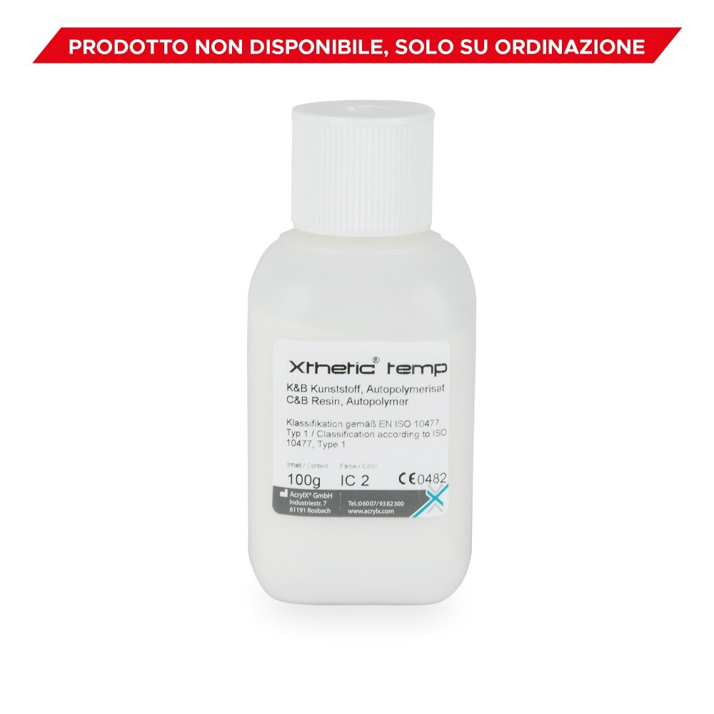 Cold acrylic resin for long-lasting aesthetic temporaries with low monomer content; It is made of "hybrid microspheres" and consists of two grain sizes: 70% corresponds to the normal one (60-70 μm) and 30% to 10 μm. The result is a more compact structure with a very low level of contraction after curing. Because less monomer is needed, the resin is more biocompatible and hypoallergenic. The mixing of powder and liquid is more homogeneous and can be poured more easily; it requires a lower temperature during the curing process and makes this resin less porous than classic temporaries; consequently, the color remains unchanged over time, does not absorb bacteria and provides less release of monomer after polymerization. Mixing ratio 10:5. (mixing ratio intended by weight). GUARANTEED IN THE ORAL CAVITY 12 MONTHS.