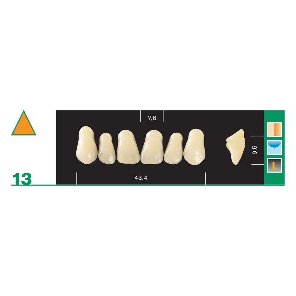 Available in the colors A1 - A2 - A3 - A 3.5 - A4 - B3 - C3 - D3 and in a complete assortment of 48 front and 20 rear shapes.