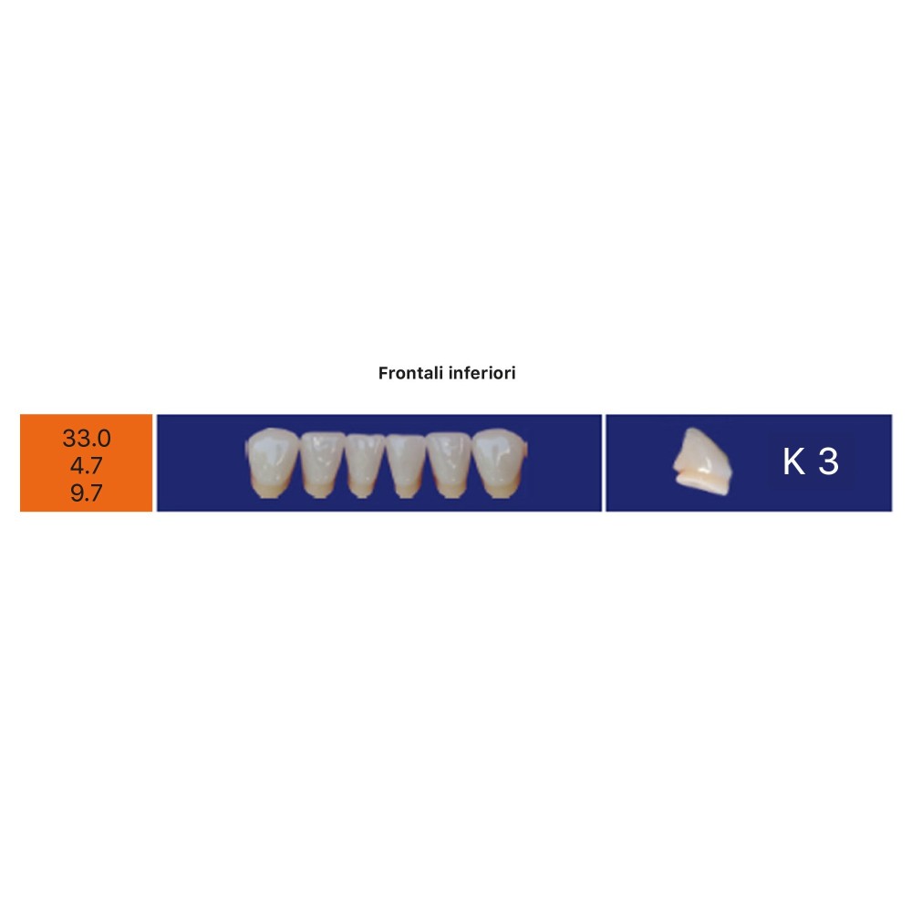 Three-layer resin teeth for removable prosthetics. Fluorescent, colour stability over time and high abrasion resistance.