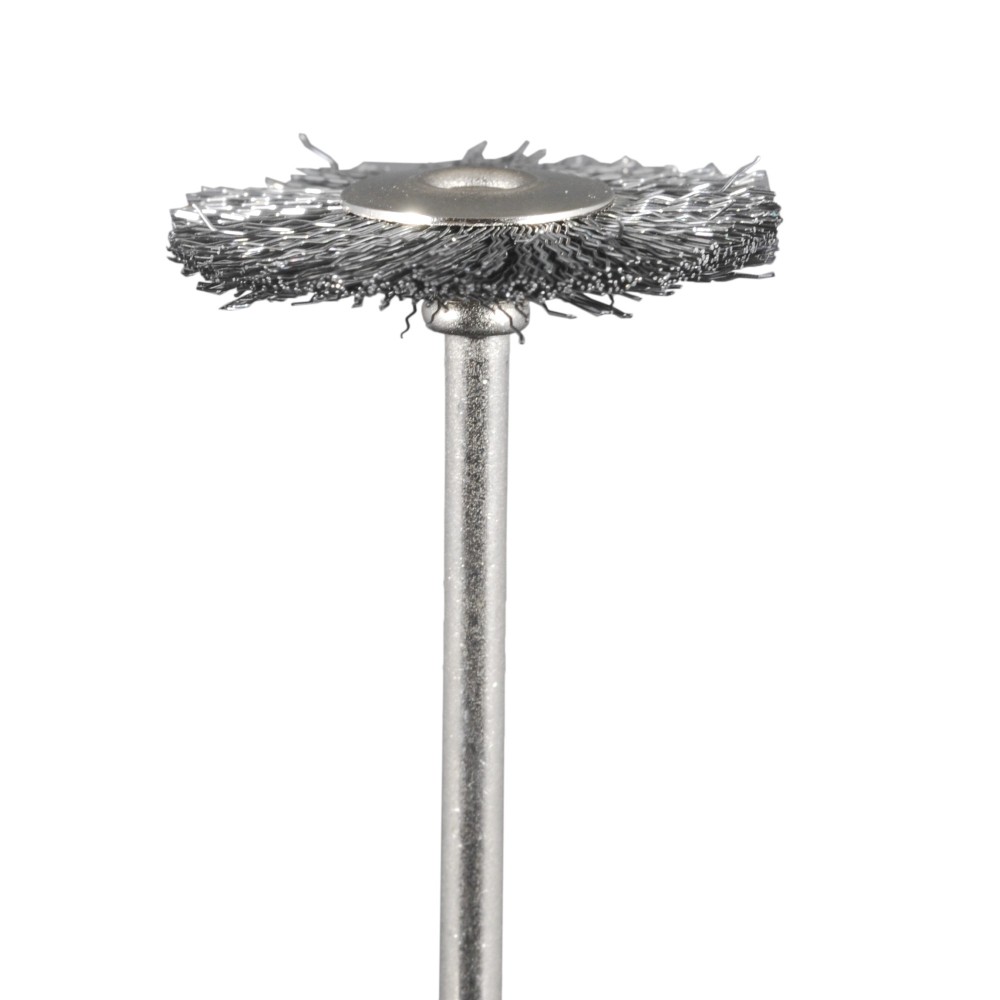 Brush mounted in steel wires for satin finishing and cleaning of metals.