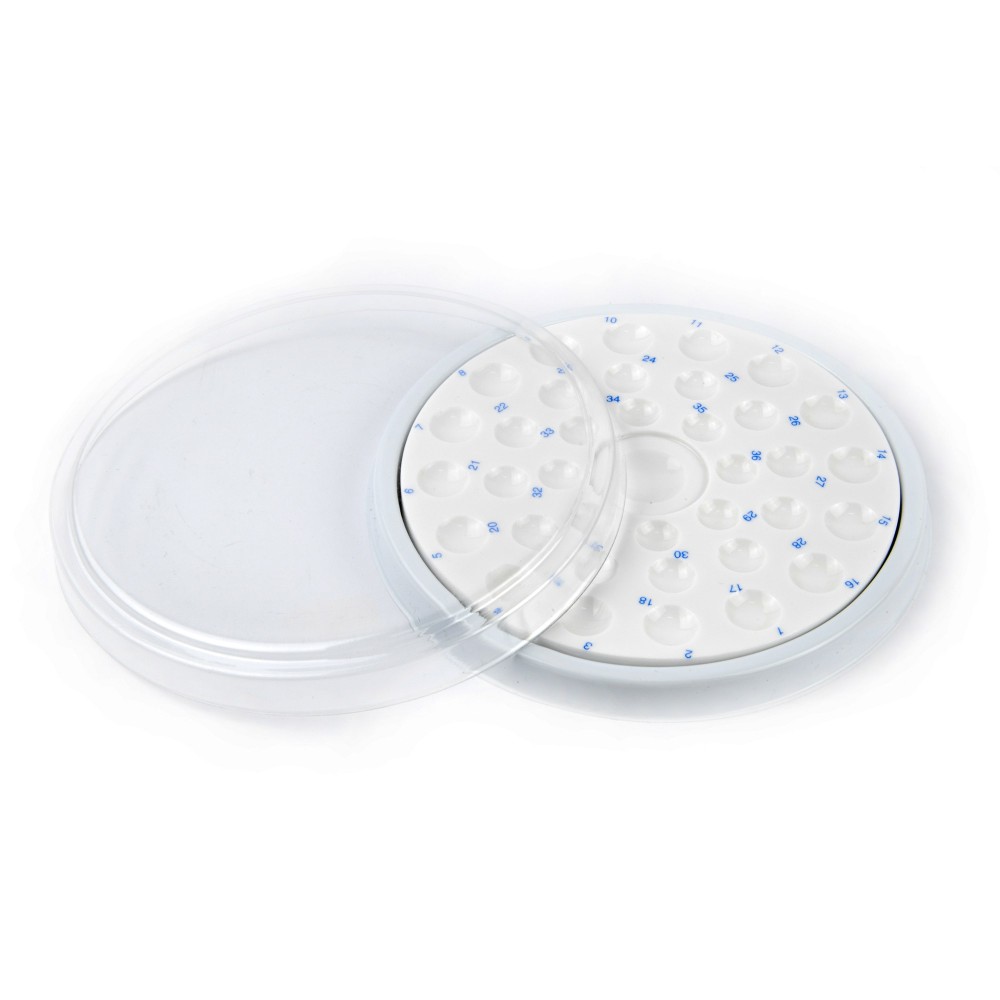 Ceramic plate with 36 wells, 16 of which are larger on the perimeter, 20 slightly smaller on the inside and a large central one for glazing. Compared to traditional plates, it has the particularity of having numbered wells, so that stains can be easily recognized even if for different materials or companies (internal stain, ceramic, zirconium, composite, etc.). Equipped with a transparent plastic anti-dust cover.