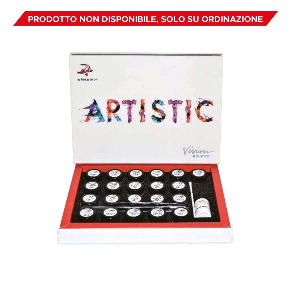 Vision 3D Artistic and Vision 3D Artistic Gingiva are kits of pasty ceramic masses with an opalescent and fluorescent effect for coloring, structuring and glazing. It is possible to achieve esthetic results comparable to those of layered restorations with the time of a stain. It is composed of ceramic gels, whose coloring is set according to the classic layering masses. This system is ideal for zirconium, lithium disilicate and also for traditional metal-ceramic materials. Sculptur materials have a paste-like consistency similar to composites. In addition, during processing, the color of these masses is very similar to what will be obtained after cooking, facilitating the final result. The structures created can be shaped with a brush to thicknesses of 0.1-0.4 mm. The low cooking temperature allows the surface characteristics to be maintained, guaranteeing an excellent aesthetic result with only two cookings. MADE TO ORDER.