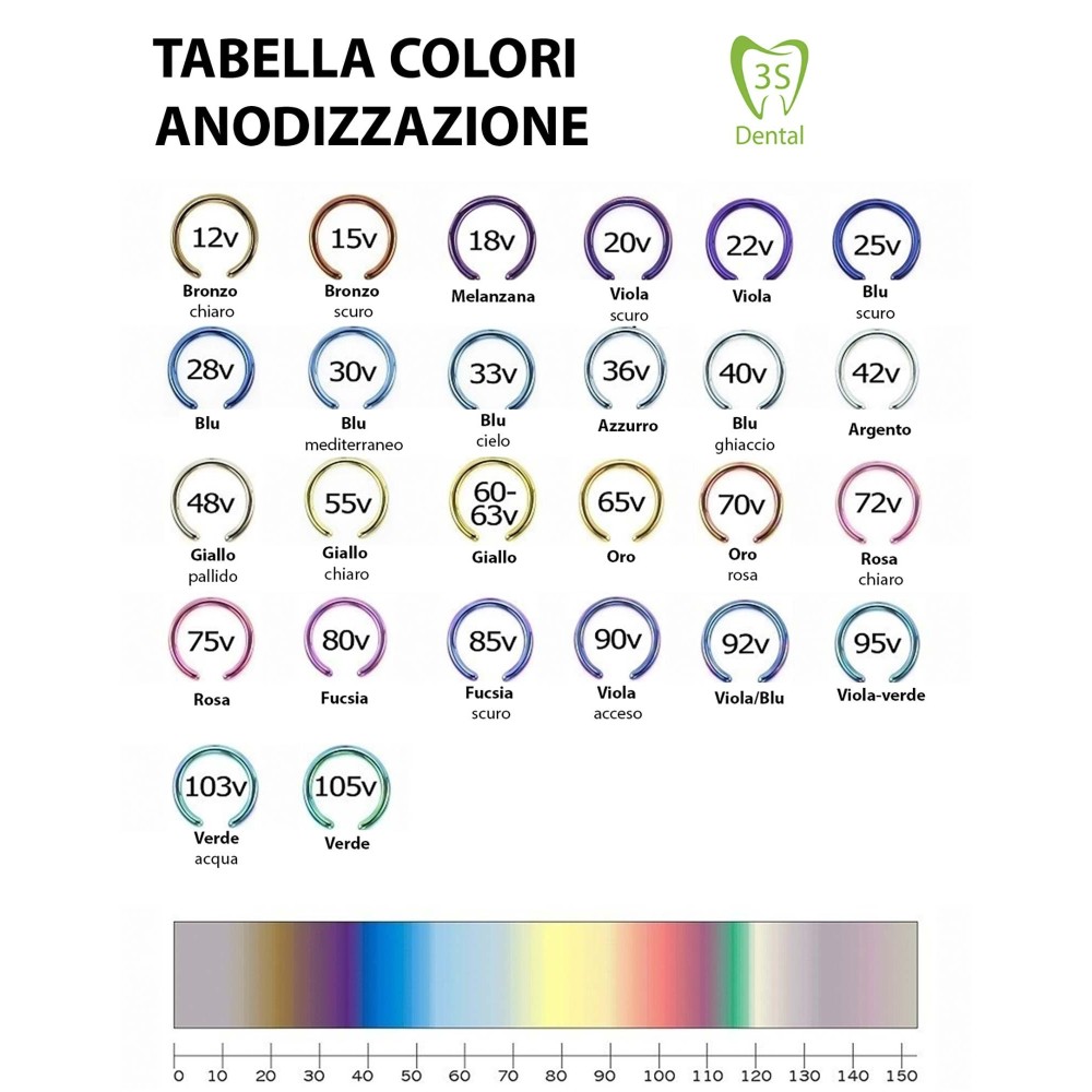 In dentistry it aims to color only the surface of titanium without altering its surface chemistry, maintaining its biocompatibility characteristics; technique that can be used on any titanium-based material. The peculiarity of titanium anodizing consists in the possibility of applying colors to the object, without the addition of additional thicknesses, making it take on a wide range of colors and shades. The kit comes complete with detailed instructions and is easy to use and needs little maintenance.
