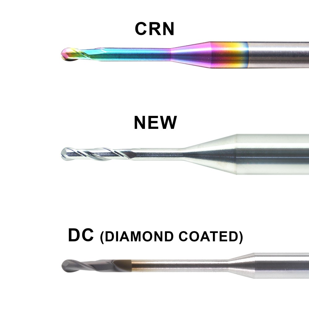 Il trattamento CRN (al nitruro di cromo) rende la superficie più dura e più liscia, riducendo notevolmente l’attrito e il riscaldamento, aumentando così la durata . Sono ideali per la fresatura del PMMA, in quanto tendono a scaldare meno e a non impastarsi. Sono adatte per le macchine che fresano sia in umido sia a secco.