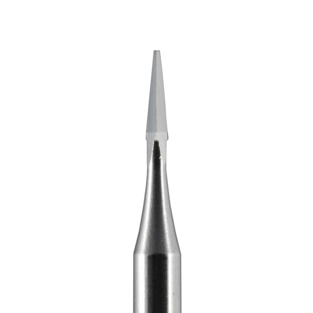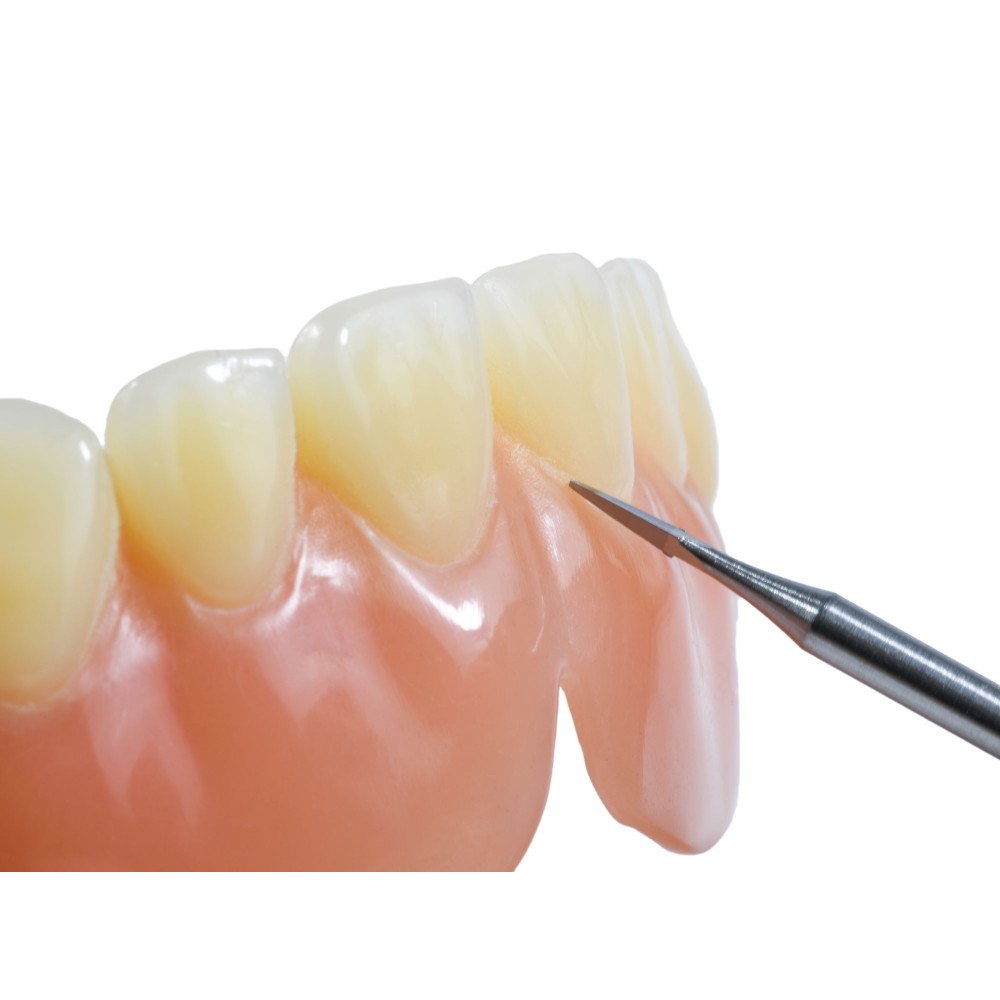 Fresa al carburo di tungsteno a tre facce con testa piatta adatta alla rifinitura dei colletti nelle protesi mobili o per aprire i solchi dei provvisori e denti artificiali in resina. Lunga durata. Con punta tronca.