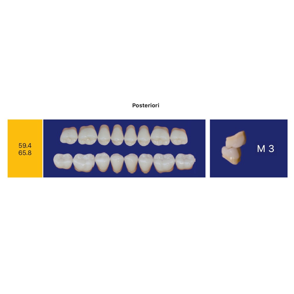 Denti in resina a tre strati per protesi mobile. Fluorescenti, stabilità del colore nel tempo e alta resistenza all’abrasione.