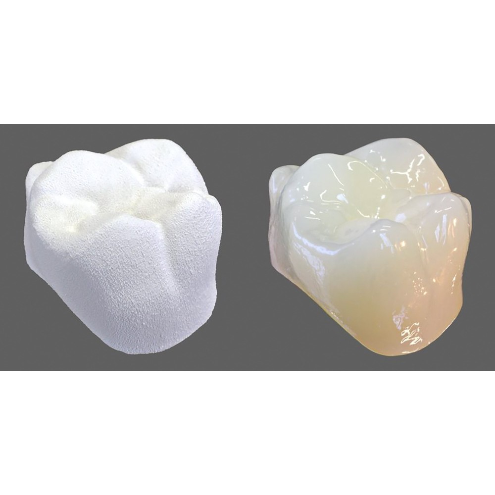 prive di pori e apportando una lucentezza unica; crea un legame adesivo superiore, migliora la durezza superficiale e la rugosità dello zirconio per una ridotta abrasione dell’antagonista. Grazie al suo spessore ultra sottile, i dettagli, le fessure e l’occlusione sono preservati.
